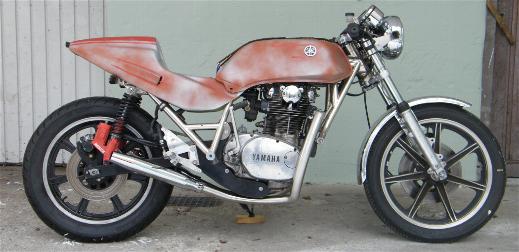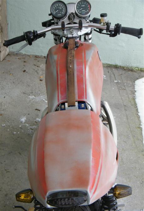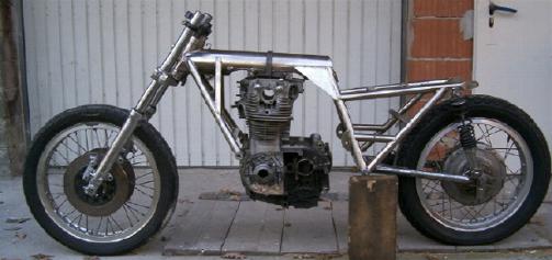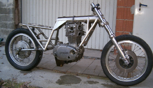 Nach einigen Irrungen und Wirrungen sieht das ganze jetzt schon aus wie ein richtiges Moped . Die am Anfang verbaute Gabel einer FJ1100 ist der einer TX 750 gewichen. Der Tank,man höre und staune, ist von einer CB400N und passte nach kurzem Einsatz von Flex und Schweißgerät wie für diesen Umbau gemacht. Räder,Bremsanlage und Armaturen stammen aus dem XS Teileregal(XS500 XS650). Die Sitzbank gehört eigendlich auf einen Ducatitiefflieger und wurde um ca.10cm "verschlankt",sieht zwar auf dem Bild immer noch nach fettem Arsch aus aber das täuscht.